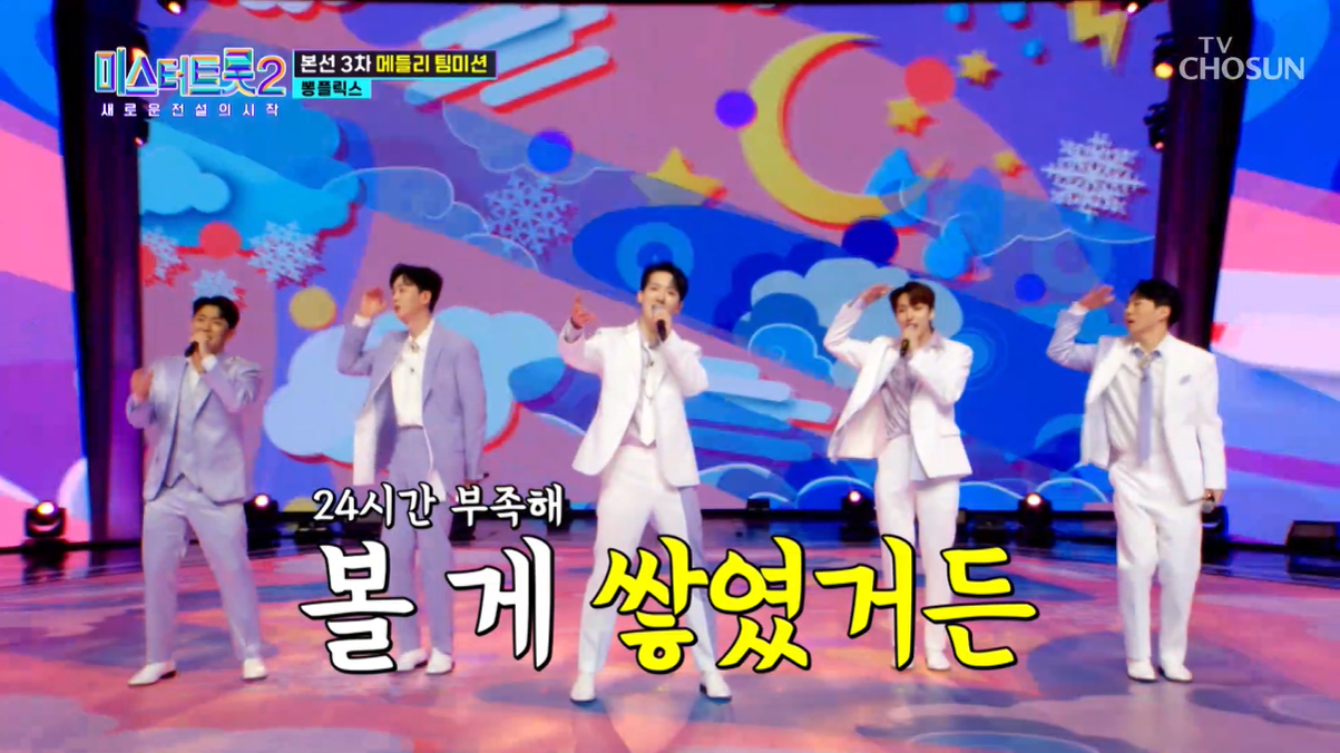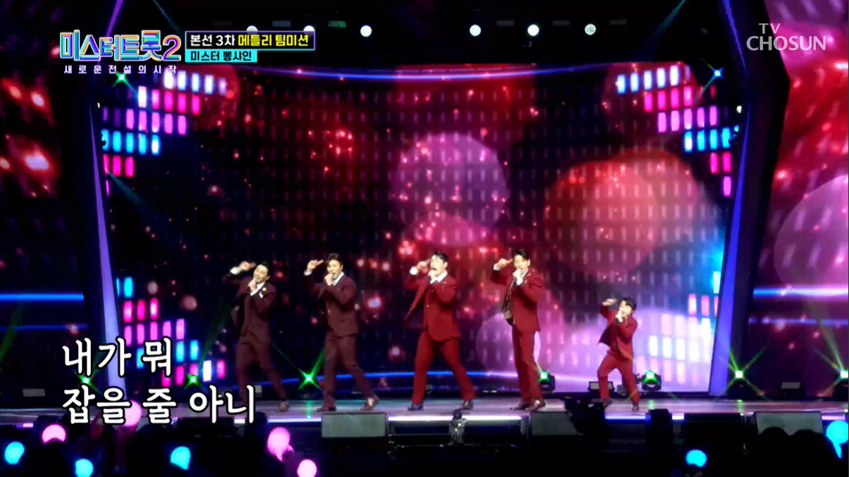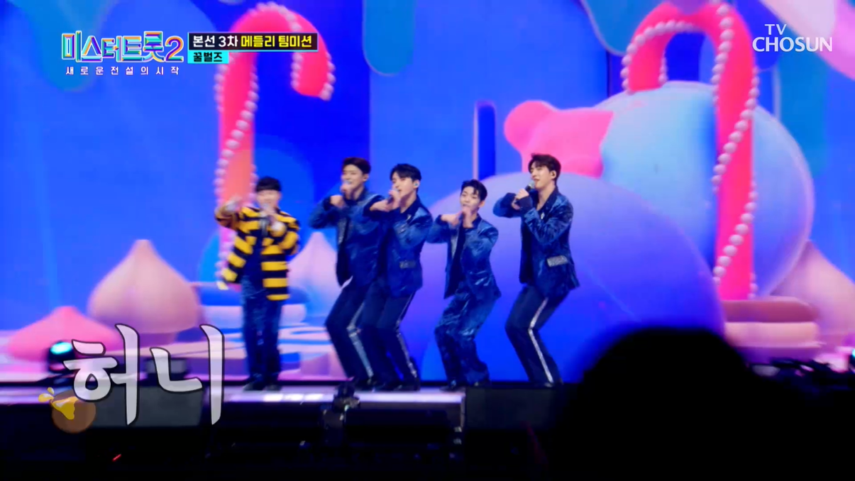 두 번째 무대는 박지현, 강재수, 송도현, 성리, 장성호가 함께 한 '꿀벌즈'가 올랐습니다. 아이돌의 노래를 부르며 귀엽고 애교 많은 모습들을 보여주었습니다. 1481점(마스터 1214점, 관객 267점)을 받아 '미스터 뽕샤인'을 제쳤습니다.