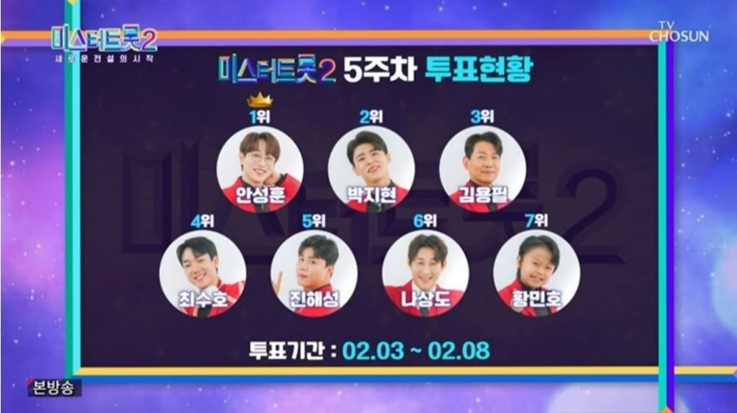 한편 5주 차 응원 투표에서는 안성훈이 응원 투표 1위에 등극했습니다. 지난주 박서진을 이기고 올라온 영향일 것 같습니다. 안성훈의 상승세가 다음 주도 계속될지 궁금합니다. 지난주 1위를 차지했던 김용필이 3위로 밀려나기도 했습니다.