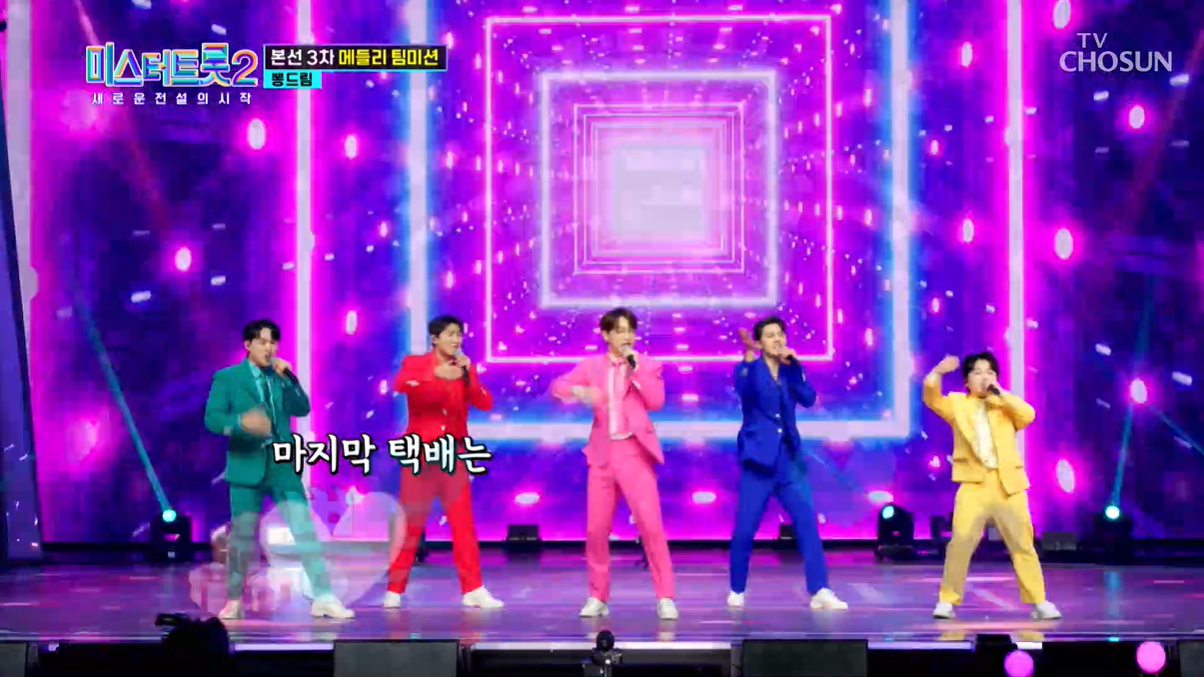 네 번째 팀은 '뽕드림'으로 안성훈, 박성온, 나상도, 임찬, 한태이가 한 팀이었습니다. 박성온을 고려한 듯한 알록달록한 옷을 입고 귀여운 율동까지 하며 활기찬 무대를 완성했습니다. 1527점(마스터 1251점, 276점)으로 1위를 했습니다. 점수를 확인하고 서로 부둥켜안고 우는 모습이 감동적이면서도 안쓰럽기도 했습니다.