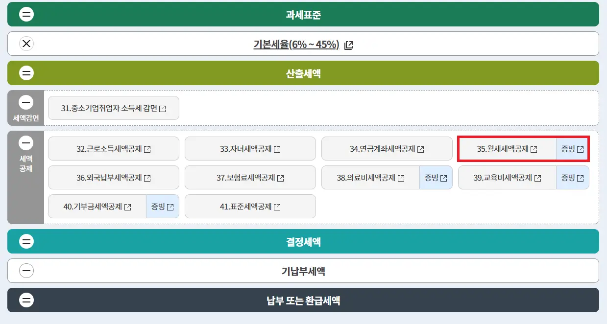 연말정산 전체 흐름에서 월세는 소득에서 공제하거나 산출한 세액에서 공제할 수 있습니다. 위 그림에서처럼 35번 단계에서 산출된 세액에서 월세를 빼 주거나 아니면 27번 단계에서 납부한 월세를 소득에서 빼 주는 방식입니다.