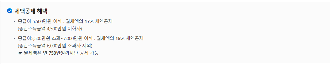 월세액의 공제한도는 연 750만 원까지입니다. 월세로 계산하면 625,000원입니다. 따라서 월세가 625,000원을 넘는다면 초과부분은 세액공제 받을 수 없으니 계약할 때 고려해볼 점입니다.