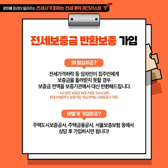 전세보증금 반환보증은 이러한 경우 경제적 약자라고 할 수 있는 임차인을 보호하기 위해 보증기관에서 우선 보증금을 반환해 주고 보증기관이 직접 임대인에게 보증금을 환수하는 제도입니다.