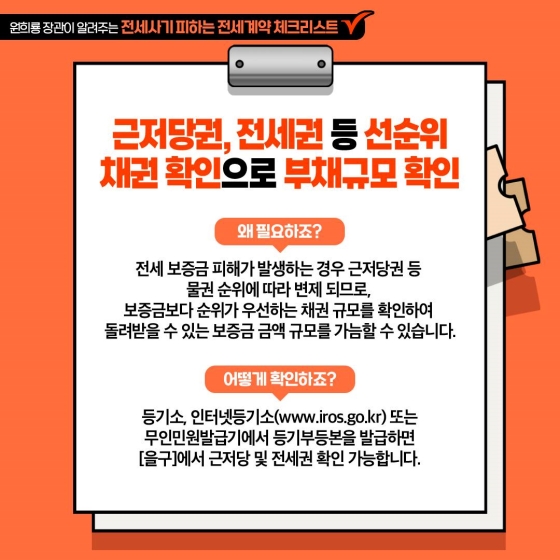 전세계약을 체결할 때 챙겨보아야 할 사항이 많습니다. 하나씩 체크리스트를 보며 체크하고 기록하지 않으면 놓치는 부분이 생길 수 있습니다. 아래 체크리스트를 이용하여 전세사기를 예방해 봅시다.